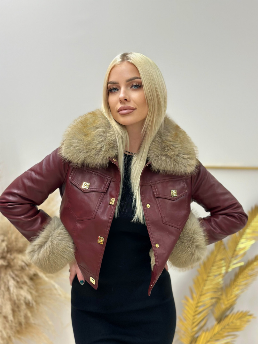 KURTKA Z EKO SKÓRY Stylowa kurtka z eko skóry to doskonały wybór na chłodniejsze dni jesieni i zimy. Wyróżnia ją elegancki kołnierz i rękawy wykończone miękkim futerkiem, które otula ciało przyjemnym ciepłem. Co więcej, futerko można łatwo odpiąć co sprawia, że kurtka nabiera zupełnie nowego charakteru – od przytulnej i luksusowej, po bardziej klasyczną i minimalistyczną. Wnętrze kurtki również wyścielone jest futerkiem, które zapewnia dodatkową warstwę komfortu i ochrony przed zimnem. Całość zapinana jest na biżuteryjne napy, które dodają kurtce odrobiny blasku. Idealnie sprawdzi się zarówno na co dzień jak i na wyjątkowe okazje, nadając każdej stylizacji wyjątkowego charakteru.